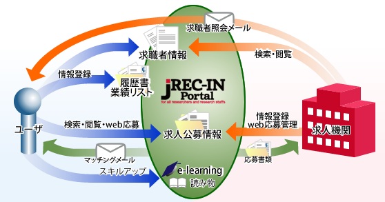 研究に関する職を希望する求職者の情報と、産学官の研究・教育に関する求人公募情報をそれぞれ収集・データベース化して、インターネットを通じて求職者、求人機関双方がそれぞれのニーズに応じた内容を検索・閲覧頂くことが可能です。